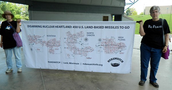 The protesters came from cities as far away as Las Vegas; Detroit; Duluth, Minnesota; and Washington, D.C. Members of Veterans for Peace were there. Some protesters wore shirts that said “Stop the Bombs” or “Build Peace, Not Bombs.” Walli wore a shirt that said “Vietnam Veterans Against the War.”