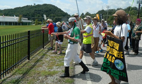 The march and rally were organized by the Oak Ridge Environmental Peace Alliance as part of a series of events that commemorate the 70th anniversary of the bombings of Hiroshima and Nagasaki, Japan, near the end of World War II. Uranium for the first bomb, the Little Boy atomic bomb that was dropped over Hiroshima on August 6, 1945, was enriched at Y-12.