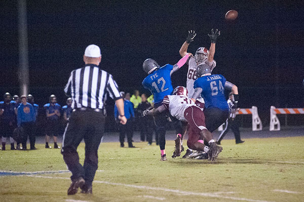 Oak Ridge senior defensive end Alex Alcorn (66) tries to block a pass from Beavers quarterback Greg Tye (12) during a 56-14 win for Oak Ridge at Karns on Friday, Oct. 2, 2015. (Photo by Julio Culiat)