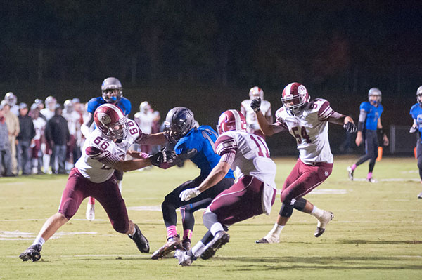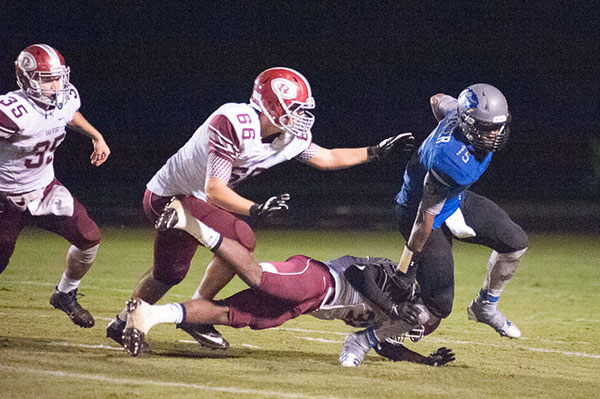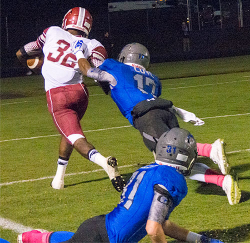 Senior linebacker Adam Manookian (35) and defensive end Alex Alcorn (66) join another Wildcat (whose number is partially obscured) in trying to stop senior Devin Harper of Karns, an Oklahoma State commitment, during a 56-14 win at Karns on Friday, Oct. 2, 2015. (Photo by Julio Culiat)