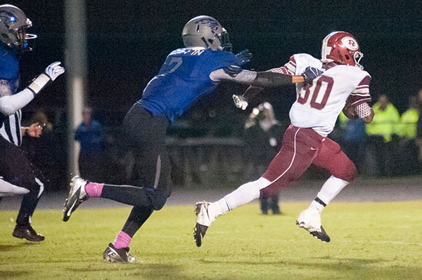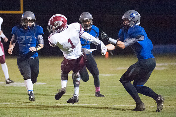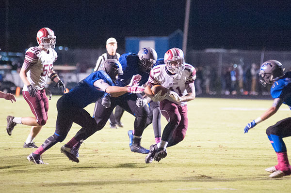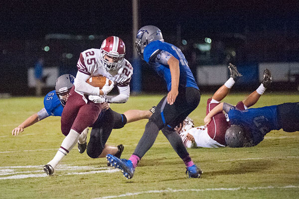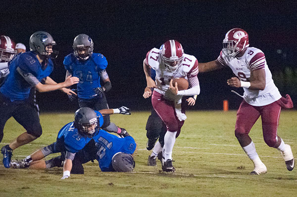 Senior quarterback Logan Fadnek (17) breaks tackles and gains extra yards in a fourth-quarter run during a 56-14 win at Karns on Friday, Oct. 2, 2015. (Photo by Julio Culiat)