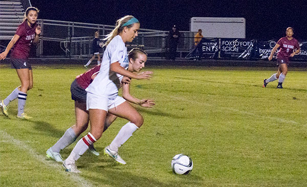 Oak Ridge senior Macy Barclay (4) rushes toward the soccer ball during a 2-0 loss to Hardin Valley during a Region 2-AAA semifinal game at Hardin Valley on Tuesday, Oct. 20, 2015. (Photo by John Huotari/Oak Ridge Today)