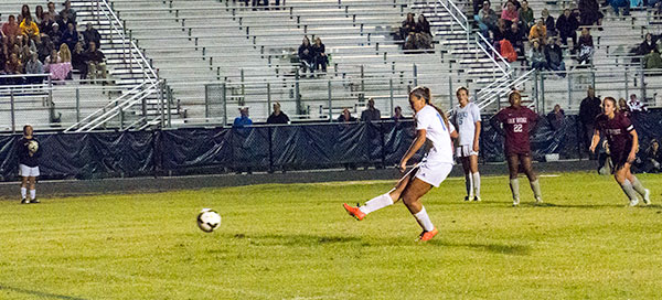 Paige Hewitt (14) of Hardin Valley aims left on a penalty kick that gave the Lady Hawks a 2-0 lead over Oak Ridge with about six minutes remaining in a Region 2-AAA semifinal game at Hardin Valley on Tuesday, Oct. 20, 2015. (Photo by John Huotari/Oak Ridge Today)