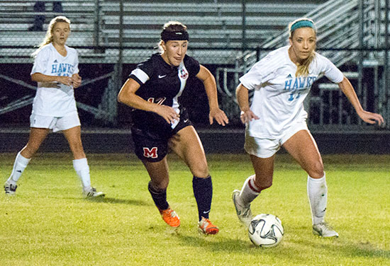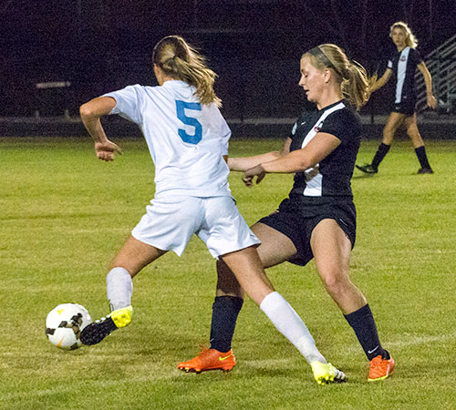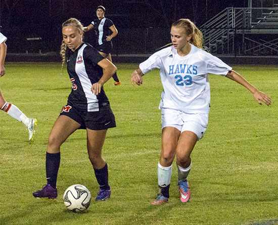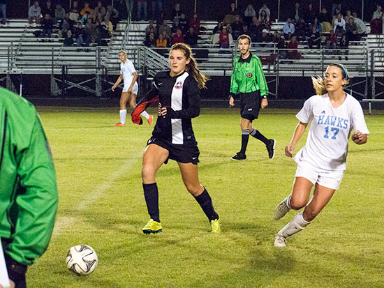 Gwen Breslin (5) of Hardin Valley tries to go around a Maryville defender during a 2-0 Region 2-AAA championship win for the Lady Hawks at Hardin Valley on Thursday, Oct. 22, 2015. (Photo by John Huotari/Oak Ridge Today)