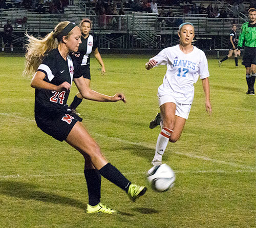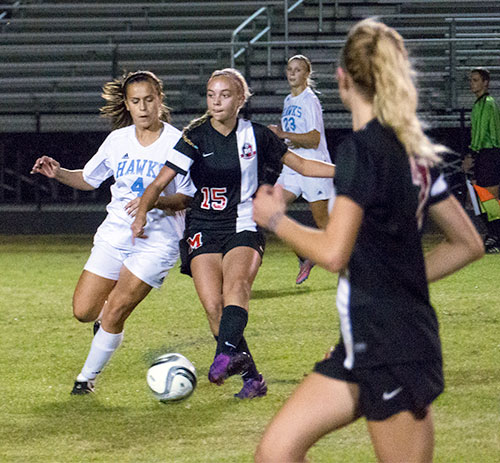 Abbey Kolaris of Maryville (24) kicks the soccer ball as Gabby Powers of Hardin Valley (17) defends during a 2-0 Region 2-AAA championship win for the Lady Hawks at Hardin Valley on Thursday, Oct. 22, 2015. (Photo by John Huotari/Oak Ridge Today)