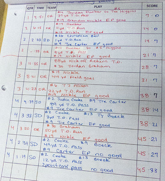 The scoring summary for the Oak Ridge Wildcats and Soddy Daisy Trojans in a first-round Class 5A playoff game on Blankenship Field on Thursday, Nov. 5, 2015. The Wildcats won 45-33. The Wildcats are red, and the Trojans are blue.