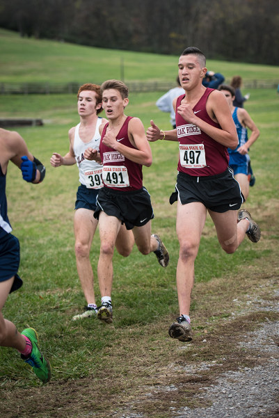 Oak Ridge senior Tyler Boullie (492) was 16th in the state Class AAA cross country meet in Nashville on Saturday, Nov. 7, 2015, crossing the finish line at Percy Warner Park Steeplechase Course at 16:36.85. Behind Boullie is junior Jake Etheridge (495), who was 22nd at 16:43.07. (Photo by Adrian Etheridge)