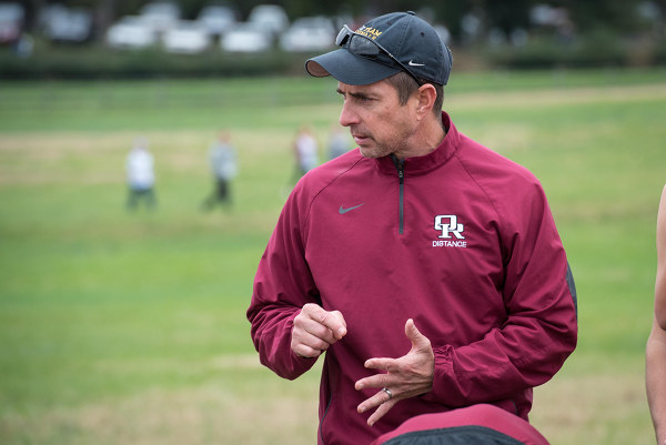 Oak Ridge Wildcats Cross Country Coach Allen Etheridge talks to his runners at the Division I Class AAA state cross country meet in Nashville on Saturday, Nov. 7, 2015. (Photo by Adrian Etheridge)
