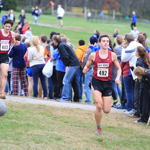 Oak Ridge senior Tyler Boullie (492) was 16th in the state Class AAA cross country meet in Nashville on Saturday, Nov. 7, 2015, crossing the finish line at Percy Warner Park Steeplechase Course at 16:36.85. Behind Boullie is senior Thomas Colburn (493), who was 20th at 16:40.94. (Photo by Steve Martin)