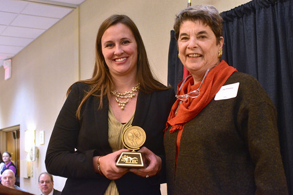 Ann Weaver, left, facilities engineer at Oak Ridge National Laboratory, received the 2015 Postma Young Professional Medal on Friday, Dec. 11, 2015. Also pictured is presenter Pat Postma. (DOE photo by Lynn Freeny)