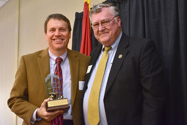 Dan Hurst, left, founder and CEO of StrataG, received one of two 2015 Muddy Boot Awards on Friday, Dec. 11, 2015. Also pictured is presenter D. Ray Smith. (DOE photo by Lynn Freeny)