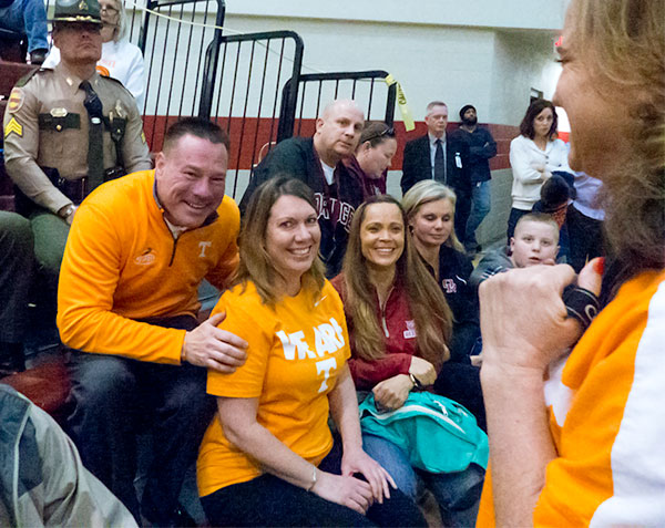 Oak Ridge Wildcats Football Coach Joe Gaddis, left, sits with Zach Azzanni, University of Tennessee Volunteers wide receivers coach, during an Oak Ridge-Gibbs basketball game at Wildcat Arena on Friday, Jan. 29, 2016. Basketball player Tee Higgins, a 6-foot-5 junior and wide receiver, has committed to play football at UT. Also pictured in front above are Holly Cross and Ric Cross. (Photo by John Huotari/Oak Ridge Today)