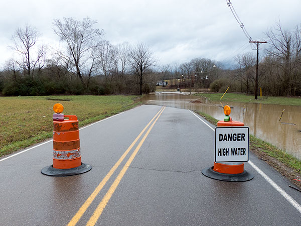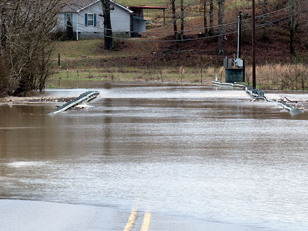 Airport Road was closed in Marlow near Oliver Springs because of flooding that covered the roadway and a bridge on Wednesday morning, Feb. 24, 2016. (Photo by John Huotari/Oak Ridge Today)