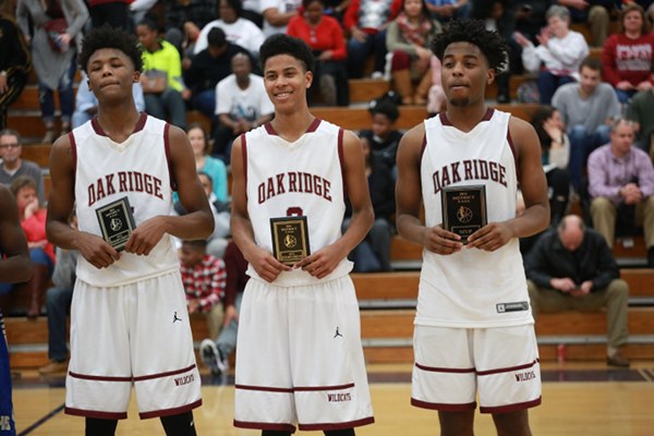 Oak Ridge Wildcats named to the District 3-AAA All-Tournament team are, from left, juniors Tee Higgins (5) and Tajion Jones (3) and senior Javien Johnson (11). Johnson was named district tournament MVP. (Photo by Luther Simmons)
