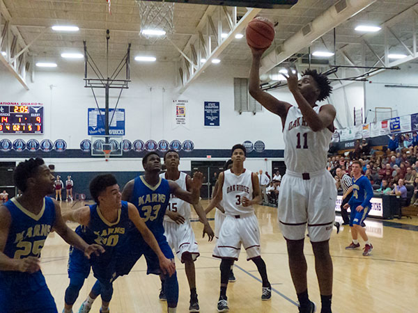 Oak Ridge junior Tee Higgins (5) had a game-high 20 points in an 88-62 victory over Karns in the District 3-AAA championship at Anderson County on Tuesday, Feb. 23, 2016. (Photo by John Huotari/Oak Ridge Today)