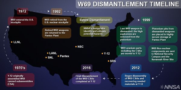 The W69 was the warhead for the short-range attack missile, or SRAM, and it was retired from the U.S. nuclear stockpile in 1992. The last W69 weapon was dismantled in 1999. The Y-12 site originally assembled the W69 canned subassemblies, or CSAs, in the 1970s and began disassembly in 2012.