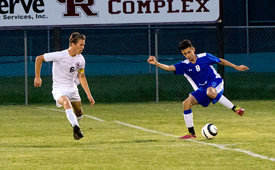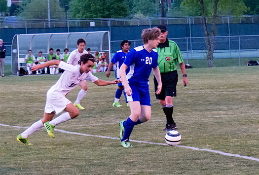 Oak Ridge junior forward Austin Vinyard battles Karns during a 6-0 win over the Beavers at home on Thursday, April 21, 2016. (Photo by John Huotari/Oak Ridge Today)