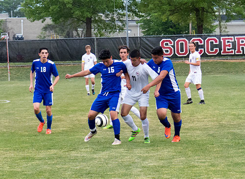 Oak Ridge senior forward Jose Rodriguez (11) battles Karns players for the soccer ball during a 6-0 win over Karns at home on Thursday, April 21, 2016. (Photo by John Huotari/Oak Ridge Today)