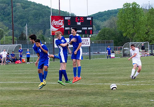 Karns players form a wall to try to block a free kick by Oak Ridge junior midfielder Noah Calhoun (7) during a 6-0 win for the Wildcats at home on Thursday, April 21, 2016. (Photo by John Huotari/Oak Ridge Today)