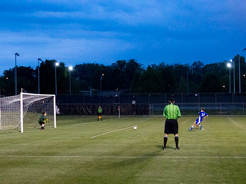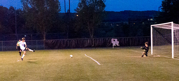 Oak Ridge scores on a penalty kick by senior Blake Clowers during a 6-0 win for the Wildcats at home on Thursday, April 21, 2016. (Photo by John Huotari/Oak Ridge Today)