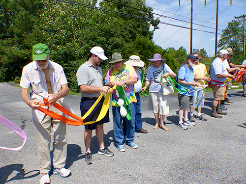 Demonstrators who oppose nuclear weapons and the proposed multi-billion-dollar Uranium Processing Facility at the Y-12 National Security Complex tie ribbons together to form a chain that they draped on the security fence at Y-12 on Saturday, Aug. 6, 2016. (Photo by John Huotari/Oak Ridge Today)