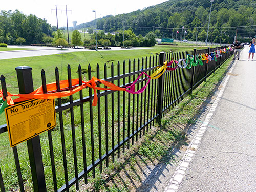 Demonstrators who oppose nuclear weapons and the proposed multi-billion-dollar Uranium Processing Facility at the Y-12 National Security Complex tied ribbons together to form a chain that they draped on the security fence at Y-12 on Saturday, Aug. 6, 2016. (Photo by John Huotari/Oak Ridge Today)