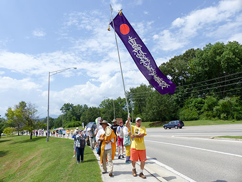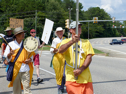 Michael Walli, one of three anti-nuclear weapons activists who broke into the Y-12 National Security Complex on July 28, 2012, leads an annual two-mile nuclear disarmament march to Y-12 on Saturday, Aug. 6, 2016. Pictured behind Walli are Buddhist monks Gyoshu Utsumi, left, and Denise Laffan of Newport. (Photo by John Huotari/Oak Ridge Today)