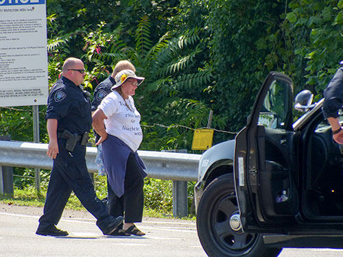 Beth Rosdatter of Lexington, Kentucky, in white T-shirt, was arrested on a state misdemeanor charge of obstructing a highway after she walked up to the federal “blue line” and sat on the pavement in front of it at the main entrance to the Y-12 National Security Complex on East Bear Creek Road on Saturday, Aug. 6, 2016. (Photo by John Huotari/Oak Ridge Today)