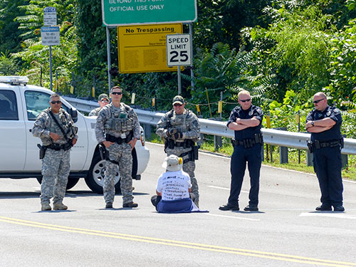 In an apparent act of civil disobedience, Rosdatter sat in the roadway, on the hot asphalt near the blue line. She appeared to be questioned by Y-12 security officers and the Oak Ridge Police Department and then detained by the ORPD.