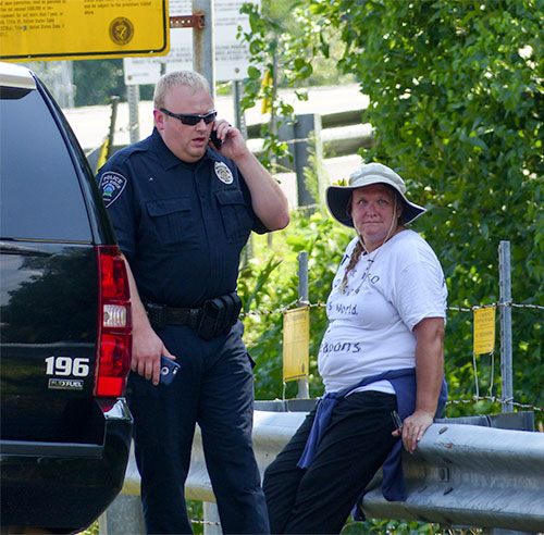 Beth Rosdatter of Lexington, Kentucky, in white T-shirt, was arrested on a state misdemeanor charge of obstructing a highway after she walked up to the federal “blue line” and sat on the pavement in front of it at the main entrance to the Y-12 National Security Complex on East Bear Creek Road on Saturday, Aug. 6, 2016. Also pictured above is Oak Ridge Police Department Lieutenant Matt Tedford. (Photo by John Huotari/Oak Ridge Today)