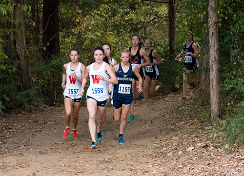 Lindsey Stallworth, center, and Madeline Shook, left, of West finished first and second in the Region 2-AAA girls’ cross country race at Victor Ashe Park in Knoxville on Thursday, Oct. 27, 2016. At right is Maddy Moody of Anderson County, who finished sixth. (Photo by John Huotari/Oak Ridge Today)
