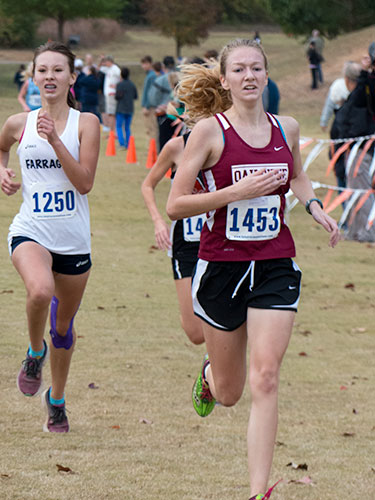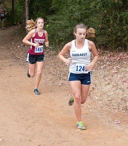 Jessie Strader of Oak Ridge finished 15th in the Region 2-AAA girls’ cross country race at Victor Ashe Park in Knoxville on Thursday, Oct. 27, 2016. In front of Strader is Maggie Atchley of Farragut, who finished 14th. (Photo by John Huotari/Oak Ridge Today)