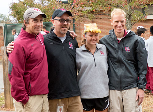Oak Ridge Coach Allen Etheridge, left, is pictured with Tom Sauer, second from left, and Ed Wright, right, and senior Maddie Zawisza after the Region 2-AAA girls’ cross country race at Victor Ashe Park in Knoxville on Thursday, Oct. 27, 2016. (Photo by John Huotari/Oak Ridge Today)