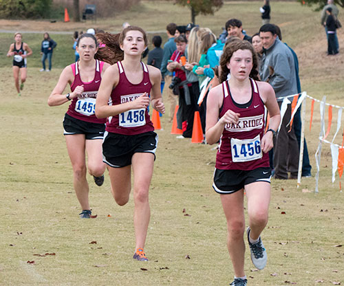 Oak Ridge runners are, pictured from left to right, Maddie Zawisza, who finished 24th; Robyn Wood, who finished 23rd; and Mollie Smith, who finished 22nd in the Region 2-AAA girls’ cross country race at Victor Ashe Park in Knoxville on Thursday, Oct. 27, 2016. (Photo by John Huotari/Oak Ridge Today)