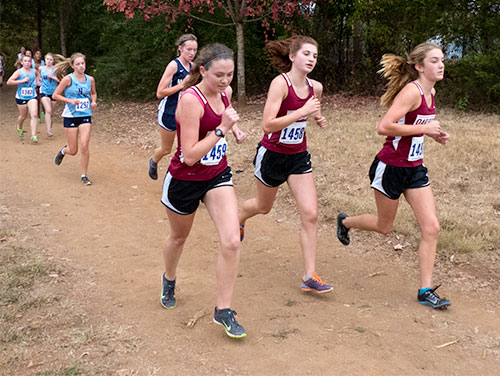 Genevieve Schwartz of Oak Ridge, at right in the group of three above, finished 10th in the Region 2-AAA girls’ cross country race at Victor Ashe Park in Knoxville on Thursday, Oct. 27, 2016. At center is Mollie Longmire of Anderson County, who finished seventh, and at left is Jenna Wall of Hardin Valley Academy, who finished eighth. (Photo by John Huotari/Oak Ridge Today)