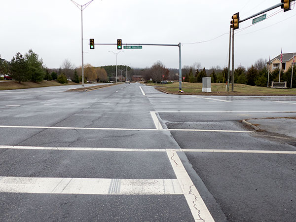 On Friday evening, Jan. 13, 2017, an SUV appeared to be going north on Lafayette Drive at the time of a fatal two-vehicle crash at the intersection with Emory Valley Road. The SUV came to rest near the stoplight pole at center, at the northeast side of the intersection. The other vehicle, a newer model Volkswagen sedan, appeared to be going south on Lafayette Drive or possibly turning left onto eastbound Emory Valley Road, the road that runs to the right here. The cause of the crash isn’t clear. This picture was taken facing north on Lafayette Drive. (Photo by John Huotari/Oak Ridge Today)