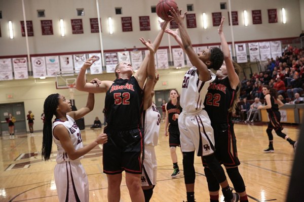 Oak Ridge junior Desiree Bates (20) battles for a rebound with Daniel Boone sophomore post Sydney Pearce (52) during a 61-44 win for the Lady Wildcats in a Class AAA sectional at Wildcat Arena on Saturday, March 4, 2017. (Photo by Luther Simmons)