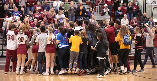 The Oak Ridge High School student section and cheerleaders celebrate the 61-44 Class AAA sectional win over Daniel Boone at Wildcat Arena on Saturday, March 4, 2017. (Photo by Luther Simmons)