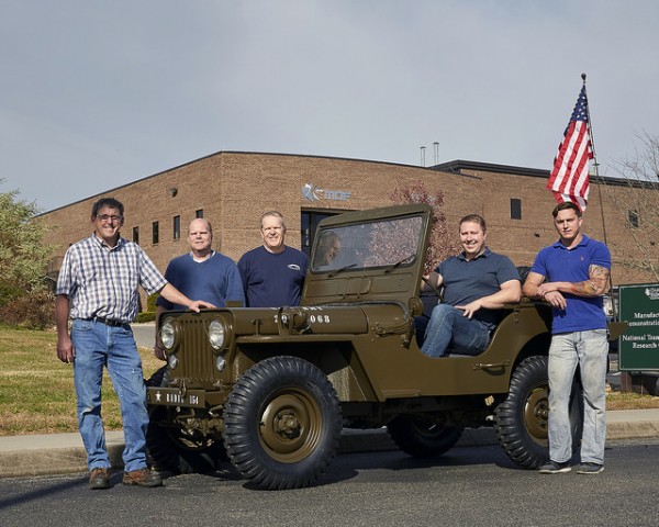 A Jeep 3D printed at Oak Ridge National Laboratory's Manufacturing Demonstration Facility in Hardin Valley. Pictured above on Nov. 25, 2015, are, from left, Steve Whitted, Lonnie Love, Craig Blue, Brian Post, and Matt Sallas. (Photo courtesy of Oak Ridge National Laboratory, U.S. Dept. of Energy)
