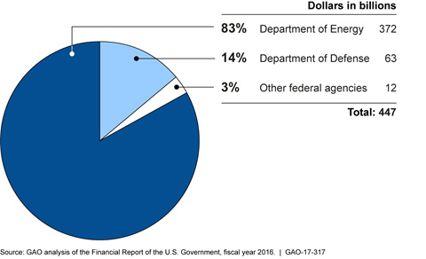 Total environmental liabilities for the federal government are estimated at $447 billion. DOE is responsible for about $372 billion of them, or 83 percent, according to a fiscal year 2016 estimate, the GAO said.