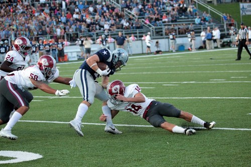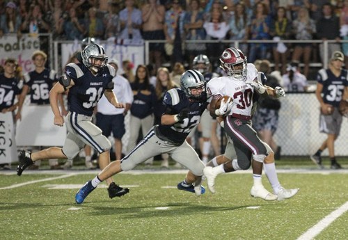 The Oak Ridge defense tries to stop a run at Farragut on Friday, Sept. 8, 2017. From left are seniors Adarius Simpson (24), Cobe Angel (22), and Jaycen McGhee (6). (Photo by Luther Simmons)