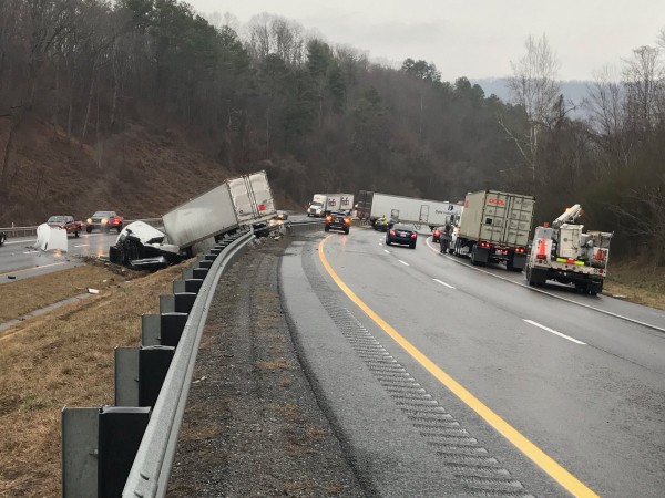 A jack-knifed tractor-trailer was reported on Interstate 40 West at mile marker 349 in Roane County. That roadway is closed, the Tennessee Department of Transportation said. I-40 East at MM 349 has one lane open. Roads are very icy in this area, TDOT said. (The Oak Ridge/Gallaher Road exit is Exit 356.)