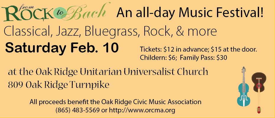The sixth Oak Ridge Rock to Bach Music Festival, presented by the Oak Ridge Civic Music Association, will showcase talented local musicians on Saturday, February 10, at the Oak Ridge Unitarian Universalist Church at 809 Oak Ridge Turnpike.