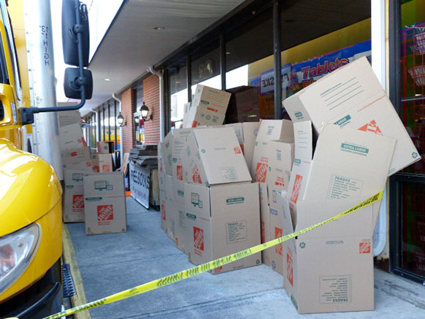Moving boxes ready to be used were stacked in front of McGuire Used Books as law enforcement searched the store on Thursday, May 24, 2018. (Photo by John Huotari/Oak Ridge Today)