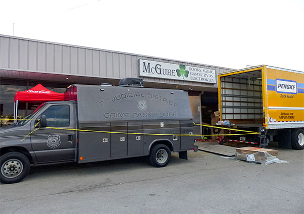 The law enforcement search at McGuire—a store that sells used books, compact discs, digital video discs, and electronics—is expected to last hours and continue through the night (Thursday night).