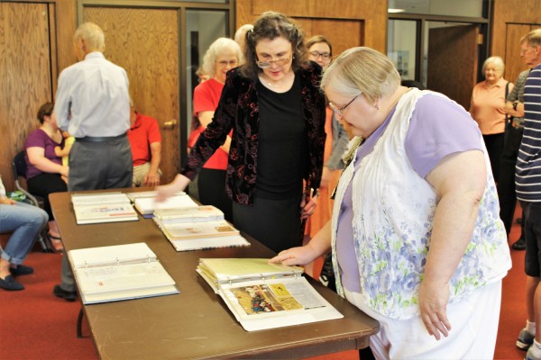 Oak Ridge Public Library Director Kathy McNeilly, center, chats with guests at her retirement celebration on Friday, June 15, 2018, as they look over scrapbooks of library history. (Photo by City of Oak Ridge)