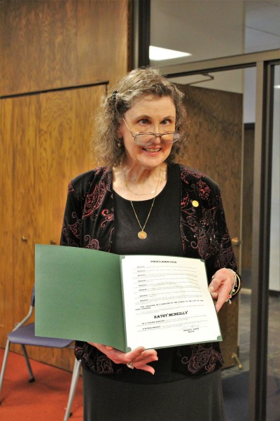 Oak Ridge Public Library Director Kathy McNeilly holds an Oak Ridge City Council proclamation in her honor at her retirement celebration on Friday, June 15, 2018. (Photo by City of Oak Ridge)
