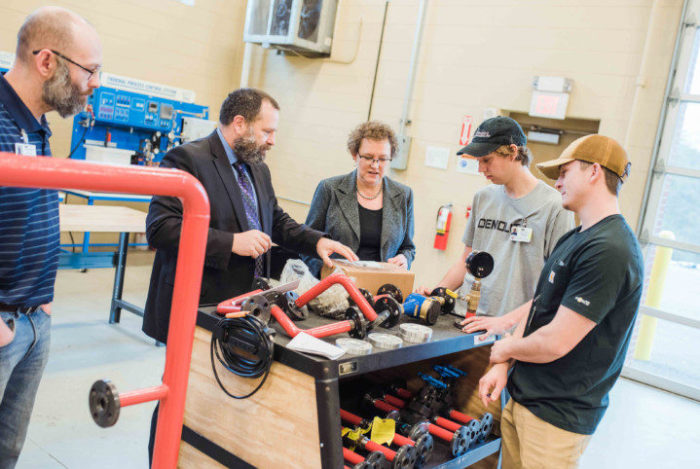 TCAT-Harriman instructor Adam Dalton, Roane State dean Markus Pomper, Roane State chemical engineering technology program director Laura Hofman, and TCAT students Orion Mount and Lucas Grizzard discuss the pipe rack built by TCAT students for use in Roane State’s chemical engineering technology program. (Photo by RSCC)