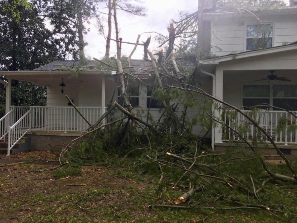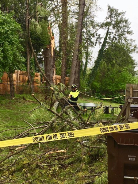 Emergency crews responded to many storm damage calls, including a roof that was partially blown off a building on Warehouse Road. Trees fell on buildings and houses and across roads.