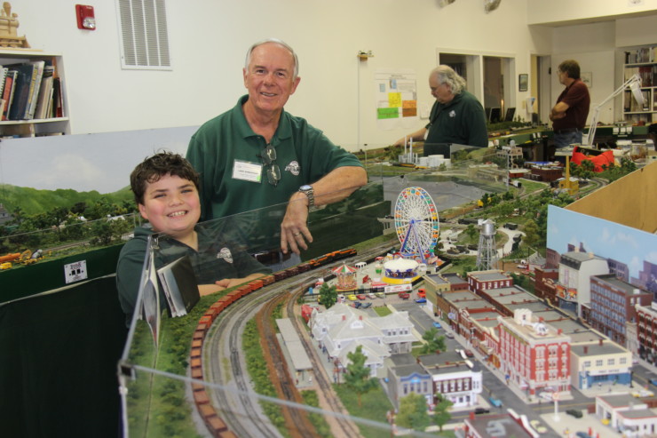 Larry Burkholder and a youth member of Knoxville Area Model Railroaders enjoy the model trains running in the group’s club room.